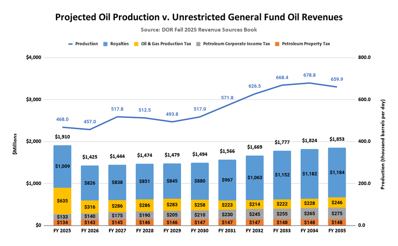 While over the period, production volumes rise by 41%, from 468,000 barrels per day (kbd) in Fiscal Year 2025 (FY2025) to 660,000 in FY2035, unrestricted general fund (UGF) revenues from oil drop by 3%, from $1.9 billion in FY2025 to $1.8 billion in FY 2035.