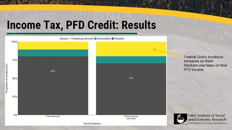 The second slide looks at two flat tax options: the first is a repeat of the one on the first slide, and the second couples the flat tax with an option to use a resident’s PFD as a credit toward the tax. By significantly increasing the share borne by the federal government through reduced federal income taxes, this additional option significantly reduces the share borne by Alaskan households.