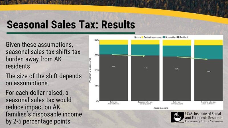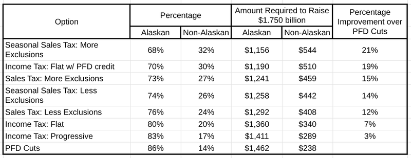 Taken together, the alternatives offer a wide range in the share of any fiscal option borne by non-Alaskans, ranging from 14% (PFD cuts) at the low end to 30% (flat income tax with credits) and 32% (seasonal sales tax with more exclusions) at the high end.