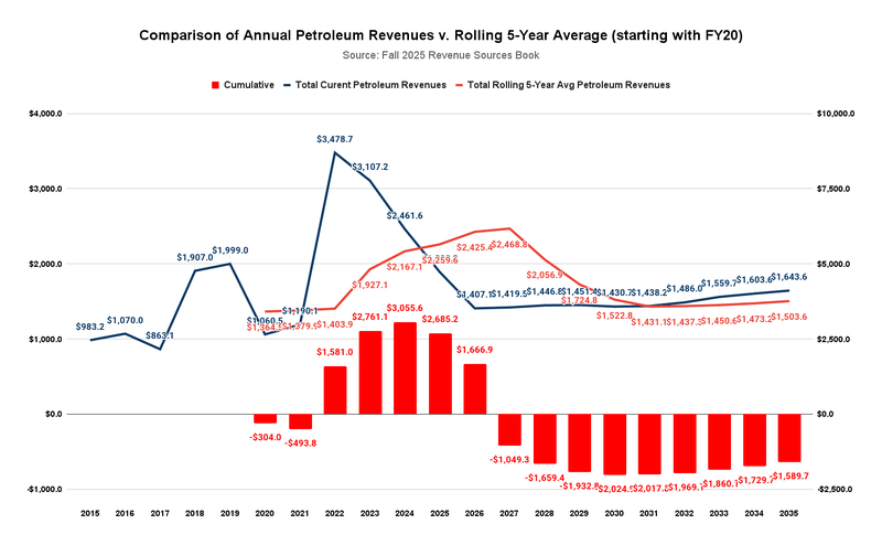As the chart shows, the mechanism would have deposited a significant amount of revenue into the stabilization account during the run-up in current oil revenues relative to the rolling 5-year average from FY2022 to FY2026. While those would have gradually reset the rolling 5-year average used for budgeting purposes to higher levels, the amount deposited into the stabilization account would have helped offset at least some of the higher spending in the subsequent period.