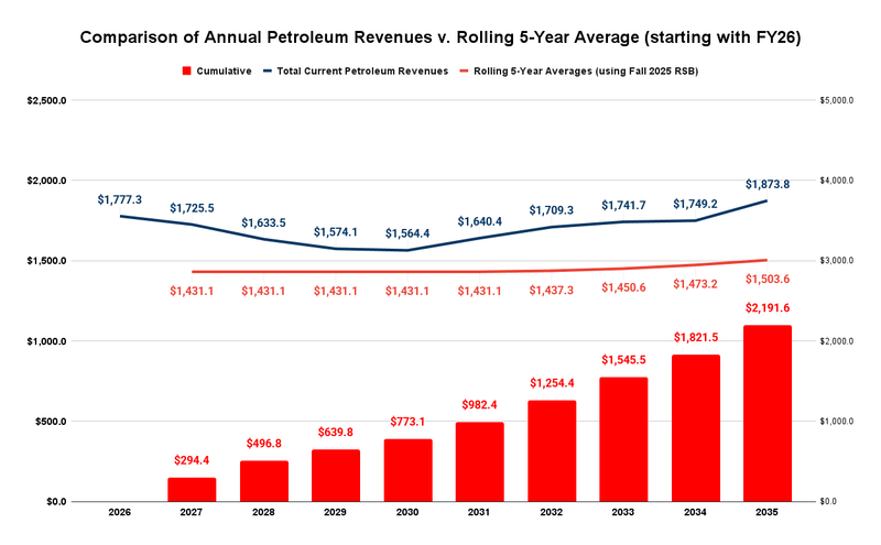 The following chart shows what a New Mexico-style stabilization approach would look like if initiated currently, using FY2027 as the first year, and, to reflect how the approach would interact with the current oil price spike, calculating current revenues based on the higher prices reflected in the current oil futures market (as of yesterday, March 5, 2026).