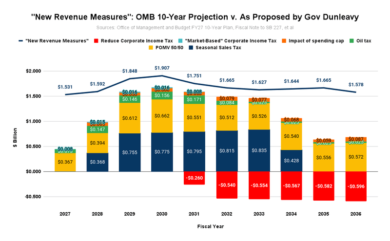 As is clear, while the administration’s proposed seasonal sales tax is the most significant contributor to “new” revenues for the duration it remains in effect, reducing the PFD from the current statutory level to a POMV 50/50 split is not far behind and becomes the largest once the sales tax expires. One significant difference from the chart we developed last week is the impact of the general and petroleum corporate income tax reductions (shown in red). In last week’s chart, those reductions had no significant effect until FY2036, the end of the period. As proposed by the Governor in SB 227, however, the impact begins much earlier, in FY2031, and grows significantly deeper over time.
