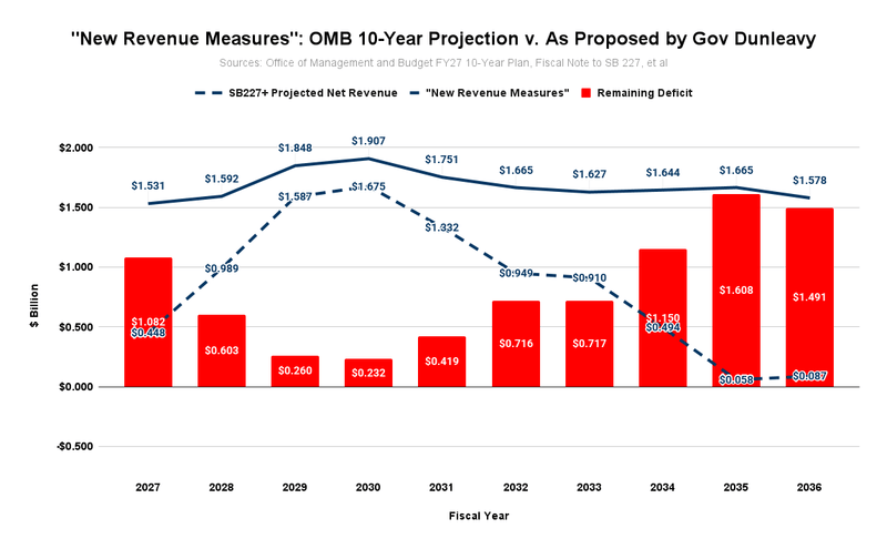 The Governor’s proposed fiscal plan raises revenue through several provisions. Some of those are reflected in Senate Bill (SB) 227, with the amounts raised noted in the fiscal note for that bill. But those aren’t all of the measures that qualify as the “New Revenue Measures” contemplated in the administration’s initial Fiscal Year (FY) 2027 10-Year Plan.