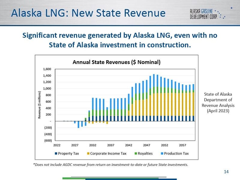 And not only is the likelihood of the “yet-to-be-finalized” Alaska LNG project highly speculative at this point, but so is the level of its potential contribution to state revenues even if it is. The most recent public estimate of potential state revenues from the proposed Alaska LNG project we can find is the following one-page slide included in a 2023 Alaska Gasline Development Corporation (AGDC) presentation.