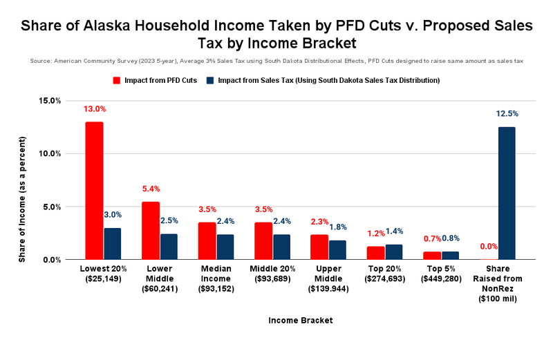 And while the share of income taken by the sales tax from those in the upper income brackets would be slightly higher than the impact of using PFD cuts, the share taken would still be less than the level taken from the remaining 80% of Alaska families. It should be hard for those in those brackets to complain about the change if they are still being treated preferentially.
