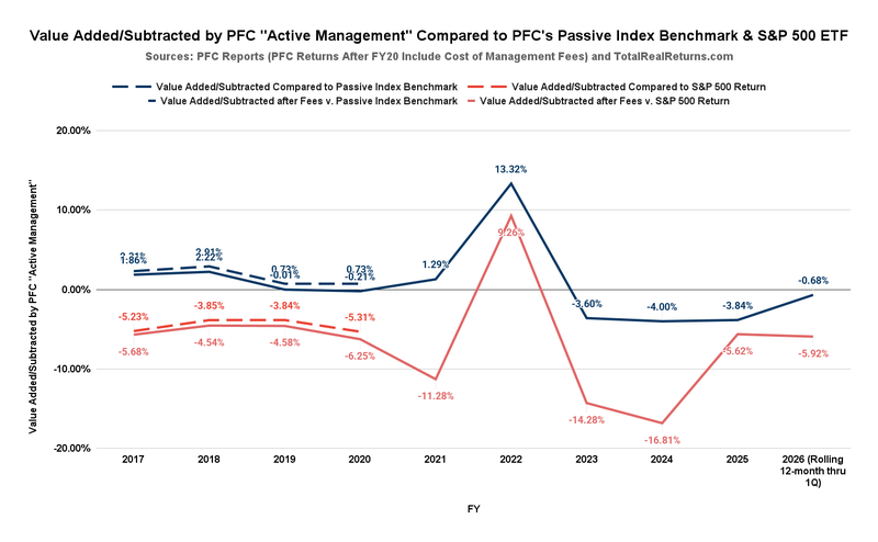 But the PFC’s approach has underperformed the PFC’s Passive Index Benchmark by 3.03% over the four years since the COVID-affected period.