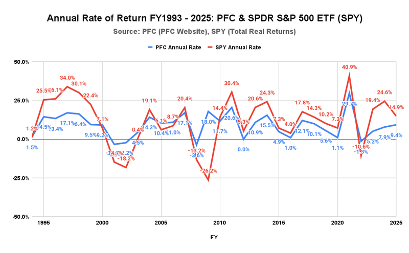 Moreover, they tend to overlook that, since the end of the 2008 fiscal crisis, the S&P 500 ETF has outperformed the PFC in every year over the subsequent 15 years from FY2010 to the present, except for one year: the COVID-affected FY2022.