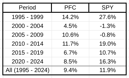To put both in context, here are the 5-year average returns under the two approaches over the 30 years. When reviewing, keep in mind that the PFC did not include the management fees it paid in its return calculation until FY2021. Thus, its results are overstated by an indeterminate amount before that time relative to the S&P 500 ETF.