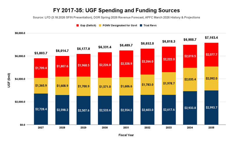 The numbers at the top reflect projected unrestricted general fund (UGF) spending levels by fiscal year, starting with the Legislative Finance Division’s (LegFin) most recent (March 18, 2026) projection of Fiscal Year (FY) 2017, 2018, and 2019 levels. Using the FY2019 level as the base, projected spending is adjusted annually for inflation at 2.5% for the remainder of the period.