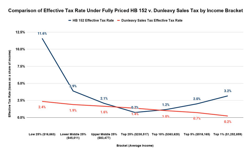 Comparing the two, it’s critical to ask how HB 152 addresses the remainder of the shortfall addressed by the Governor’s proposal. Unless the answer is to reduce spending by the difference so the additional amount is unnecessary, any legitimate apples-to-apples comparison requires accounting for it. While theoretically, one answer also might be to scale up the proposed tax rates in HB 152 to the level necessary to produce the same revenues as the Governor’s proposed sales tax, the proponents have not proposed that.