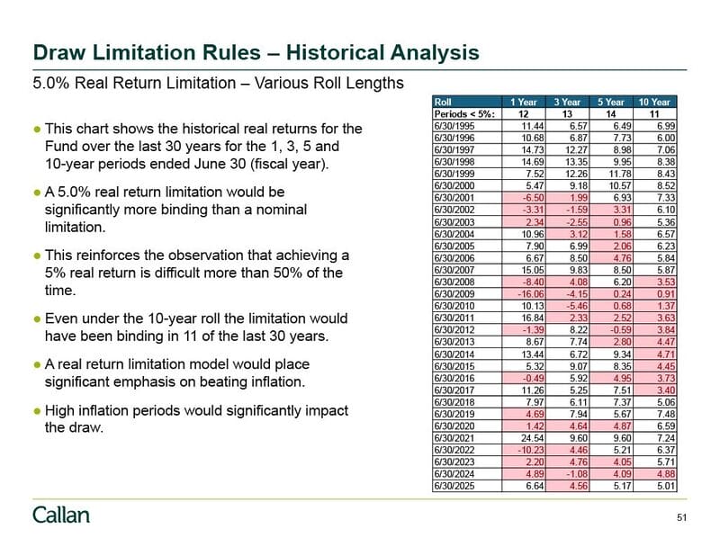 Looking at historical returns, Callan calculates that, on a five-year rolling average (next-to-last column), the time period underlying both the current POMV statute and the proposed constitutional amendment, the Permanent Fund has earned less than 5% in 17 of the 31 rolling-average 5-year periods since 1995. Put another way, it has met or exceeded 5% on a rolling 5-year average in only 14 of the 31 periods, or less than half the time.