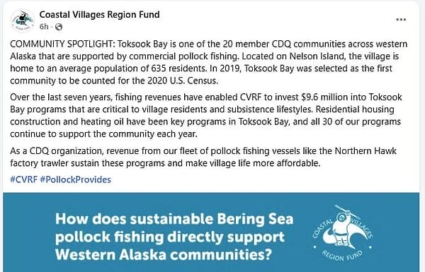 CVRF, not wanting to waste a good PR opportunity, recently made a Facebook post saying that Tooksok Bay has received $9.6 million from the CDQ program in the last seven years.