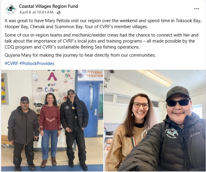 But days later, Peltola met with Coastal Village Region Fund (CVRF) – one of six Community Development Quota (CDQ) groups in Western Alaska. CVRF is the only CDG group that operates their own factory trawlers. The other CDQ groups have heavily invested in the federal groundfish fisheries, but don’t operates factory trawlers. All the CDQs except CVRF lease out their quotas.