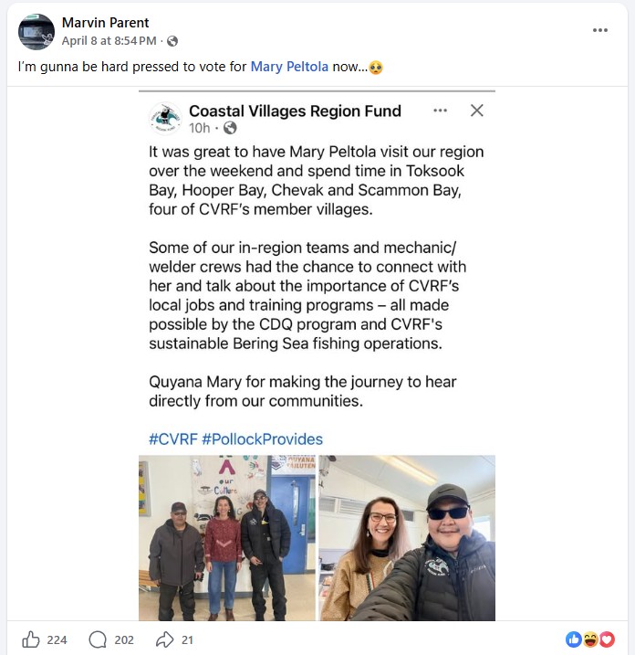CVRF’s post about Peltola was later posted in the unhinged Facebook group “STOP Alaskan Trawler Bycatch,” run by David Bayes. The comments section is filled with gems like, “Hard to be pro-CDQ and anti-trawl at the same time…..” and “She’ll probably get a lifetime supply of Pollock.”
