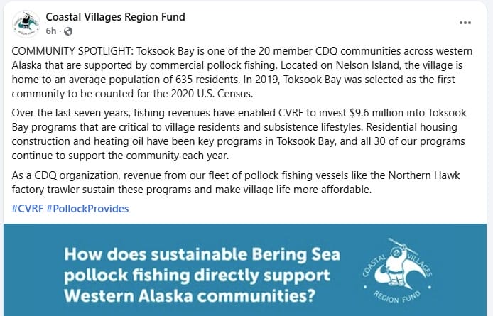 CVRF, not wanting to waste a good PR opportunity, recently made a Facebook post saying that Tooksok Bay has received $9.6 million from the CDQ program in the last seven years.
