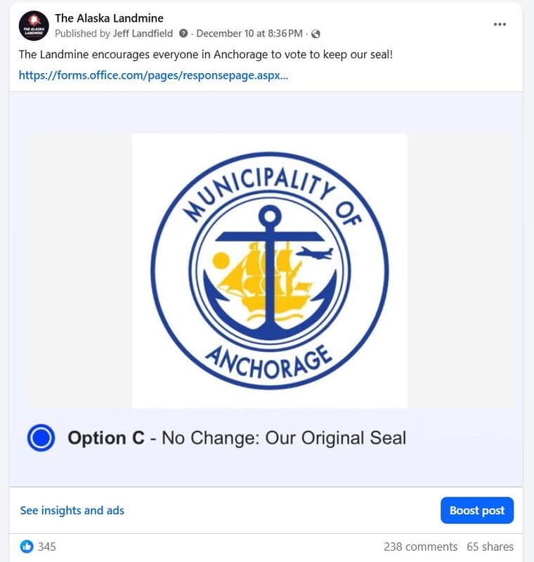 An online survey from the Anchorage Assembly where people could vote on either new designs for the city seal or keep the original one got very loose. And it looks like a Landmine social media post had something to do with it!