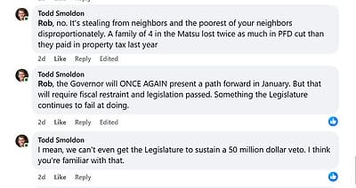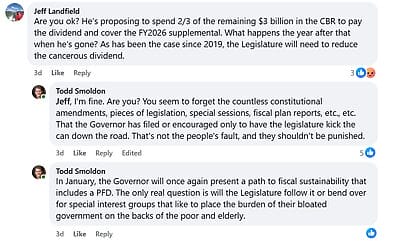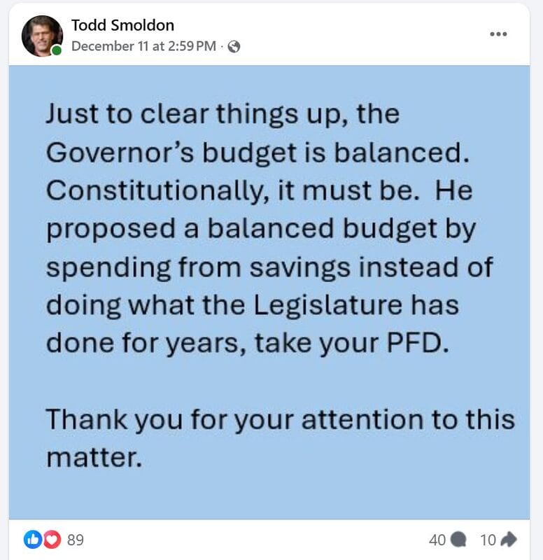 First, after Dunleavy unveiled his incomplete budget, Smoldon took to Facebook with a post that would have impressed Joseph Goebbels. In the post, he actually claimed Dunleavy’s budget is “balanced” and then blamed the Legislature for “taking your PFD.”
