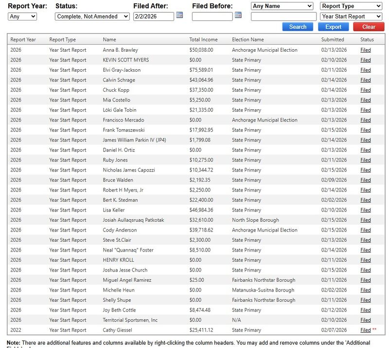 Year-start campaign finance reports for legislative, gubernatorial, and Anchorage Assembly candidates are due byTuesday night. These are the first fundraising and spending reports we will see. They cover the start of the campaign to February 1. Several candidates have already filed their reports.