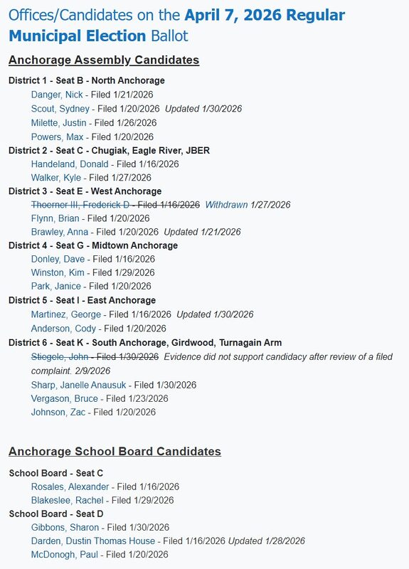 Speaking of the Anchorage Assembly, the field is set for the six Assembly seats and two school board seats up in April. Districts 1 and 4 are open seats as Assembly members Chris Constant and Felix Rivera are termed out. District 2 is an open seat as Assembly member Scott Myers is not seeking re-election. Assembly members Anna Brawley and George Martinez each have a single opponent, while Assembly member Zac Johnson has two opponents.