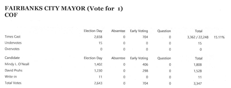 Democrat Mindy O’Neall, the presiding officer of the Fairbanks North Star Borough Assembly, defeated Fairbanks Mayor David Pruhs, a Republican, in an upset. Prior to Pruhs, Republican Jim Matherly was Fairbanks mayor for two terms. The Democrats and progressives are organized and dedicated significant resources to the race. Pruhs seems to have lost on turnout. Current results show turnout at just 15%.