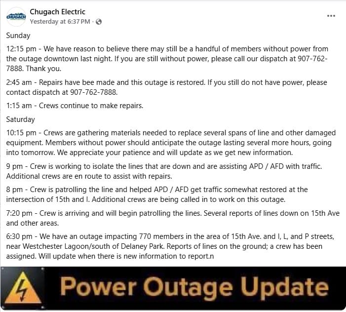 According to Chugach Electric, 770 customers were impacted. All Chugach Electric did was make a series of posts on Facebook, but never said what caused the major outage. We know it was not weather related or due to a car accident. It took over eight hours to restore power, and some customers still did not have power this afternoon. Several electricians I spoke with said while it’s possible five transformers could blow due to an animal, it is very unlikely. We all deserve to know what happened.