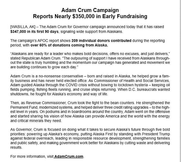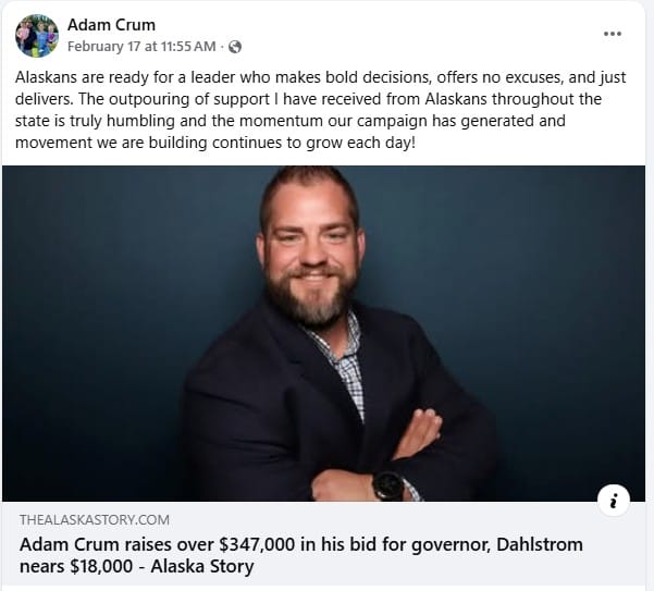 Crooked Adam Crum, who previously served as Governor Dunleavy’s Revenue commissioner and Health commissioner, reported raising $347,000.