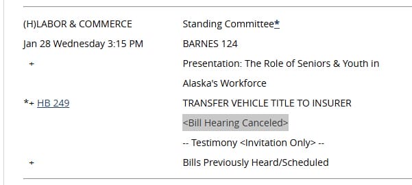 As I was walking home I looked up HB 249. It’s a bill from Representative Elexie Moore (R – Wasilla), who he worked for, that aims to use electronic signatures in place of the notary requirement for vehicle title transfers. And indeed, it was scheduled for a House Labor & Commerce hearing on Wednesday afternoon. I put that on my calendar as it was a hearing I was not going to miss. I really wanted to see him “kill it.” As it turns out, that hearing was not to be.