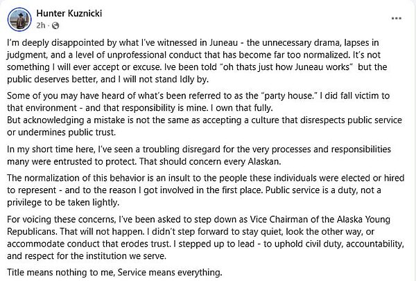 In addition to blaming Juneau party culture on his meltdown and horrible behavior, he also said he is refusing to step down as vice-chair of the Alaska Young Republicans. Their next meeting should be fun.