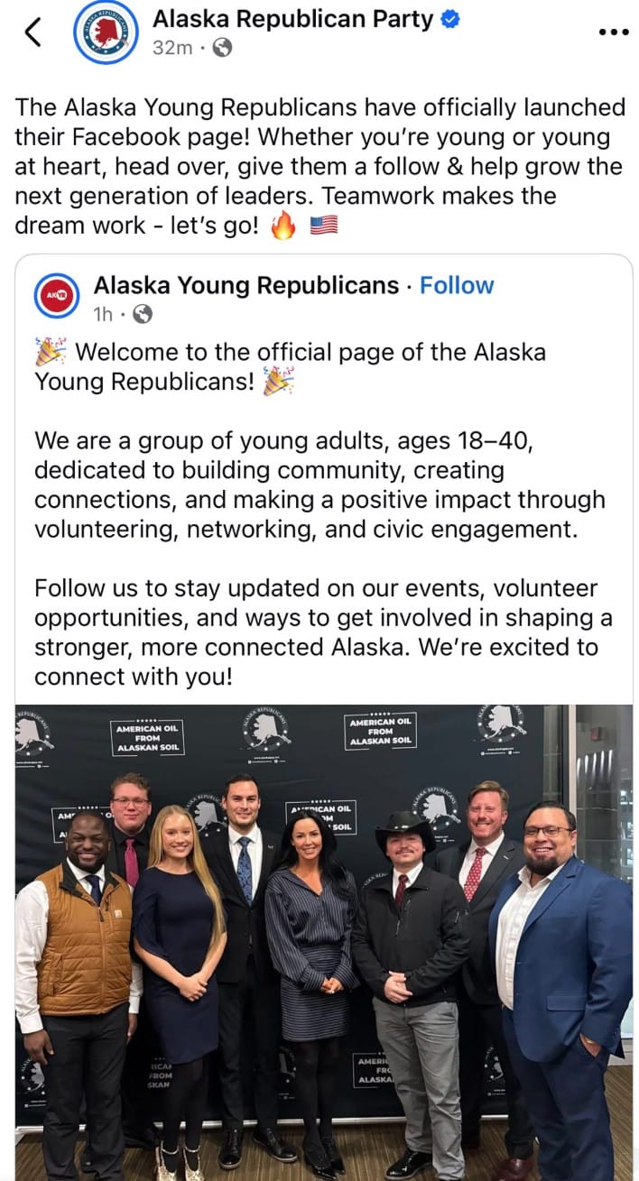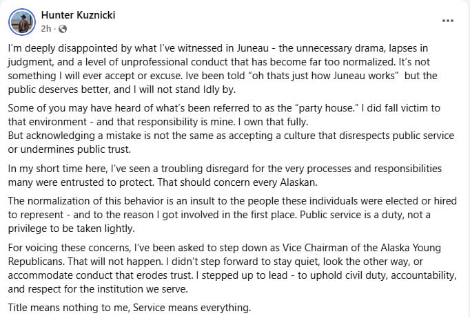 In addition to blaming Juneau party culture on his meltdown and horrible behavior, he also said he is refusing to step down as vice-chair of the Alaska Young Republicans. Their next meeting should be fun.